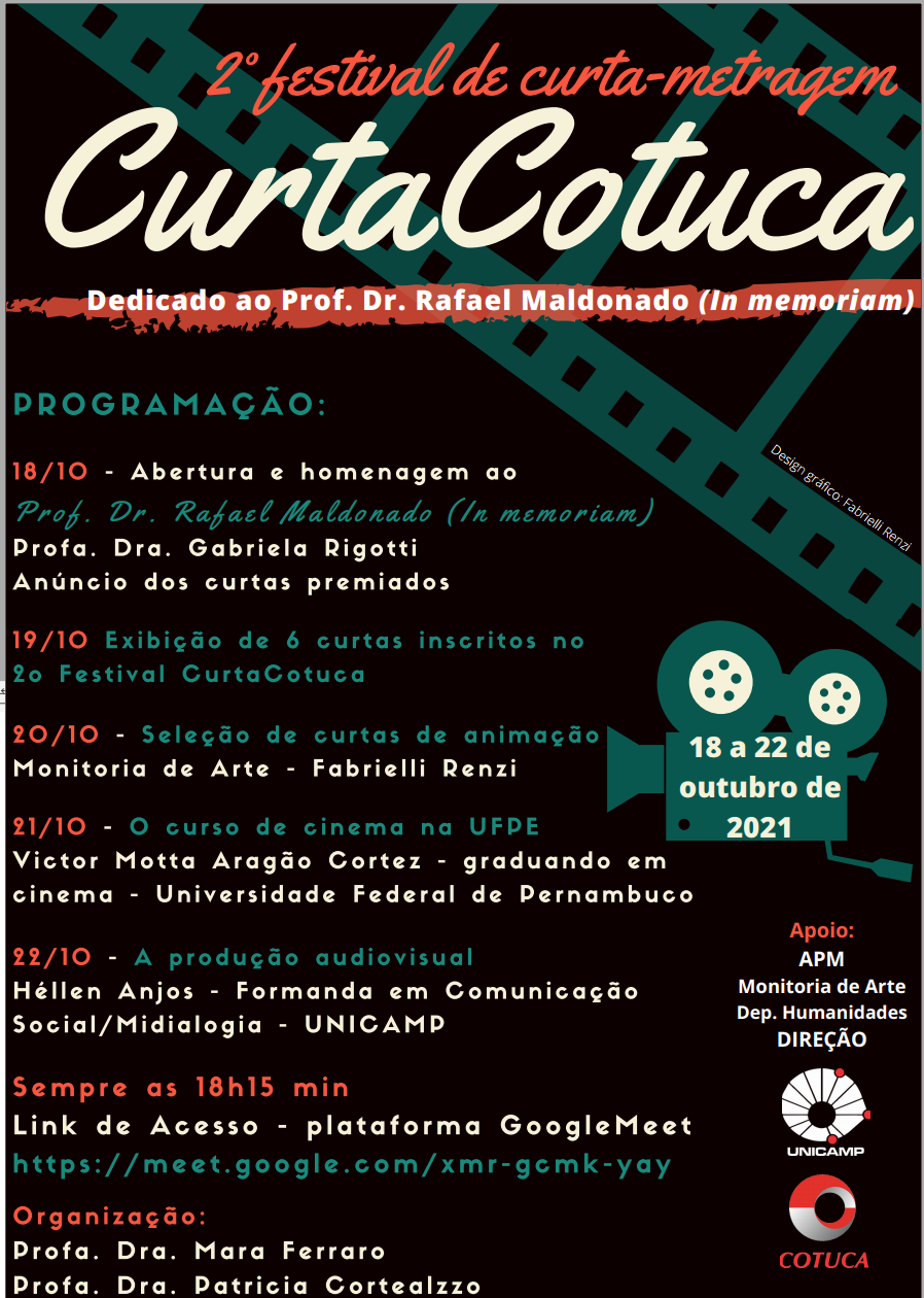 Para a abertura do 2º Festival de Curta-metragem CurtaCotuca, convidamos a Profa. Dra Gabriela Rigotti para realizar uma homenagem ao nosso querido e saudoso professor Rafael Maldonado (in memoriam), que nos deixou tão prematuramente, vítima de complicações decorrentes da Covid-19. Gabi, amiga pessoal de Rafael, gravou um emocionante depoimento sobre sua amizade com o educador, que “foi um cara vibrante e divertido, digno de muita positividade”- em suas palavras. Professor Rafael foi jurado do nosso primeiro festival, realizado em 2019, e ajudou
