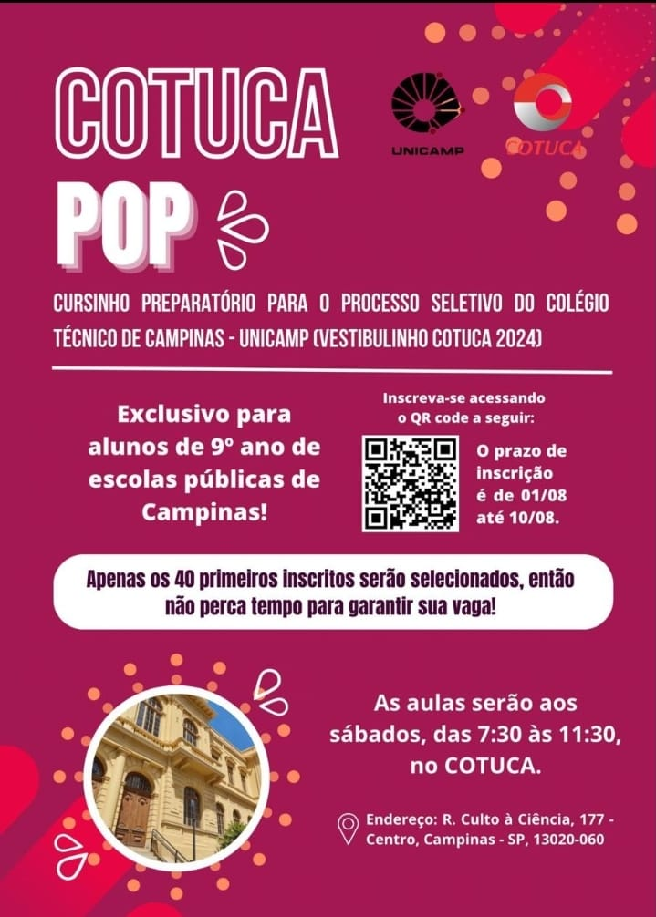 Inscreva-se no CotucaPop, o cursinho popular do Cotuca. As inscrições ficam abertas até o dia 10/08, através do link: https://forms.gle/xDRrnEq1jwcMxadH7