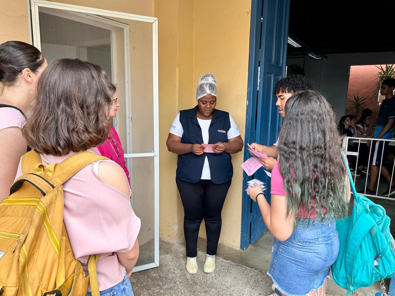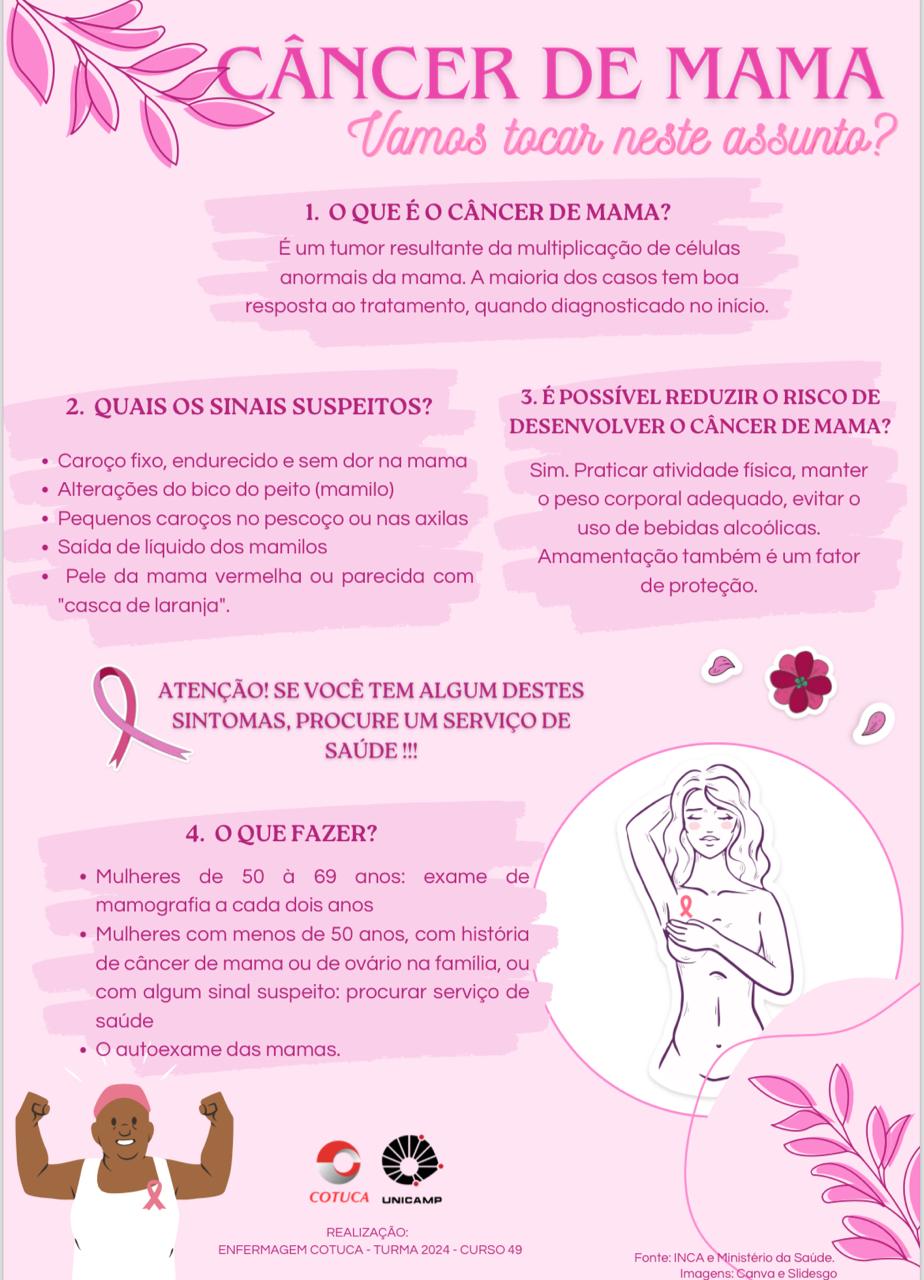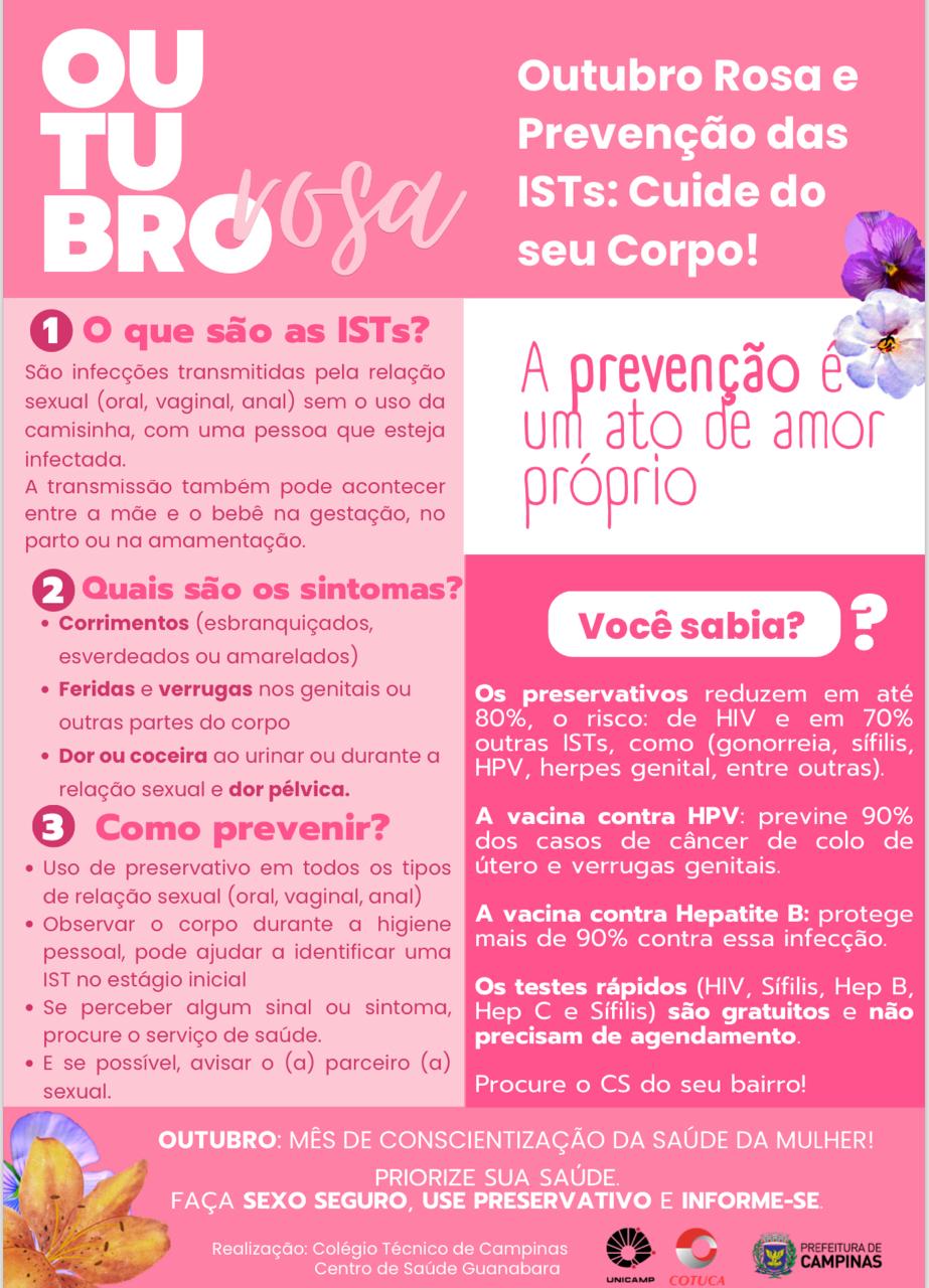 No dia 25/10 em comemoração ao Outubro Rosa os alunos do 1º ano do curso técnico de enfermagem integrado e vespertino, realizaram uma ação educativa no Colégio com as funcionárias, equipe da higiene e limpeza, segurança e do refeitório com o objetivo de divulgar informações sobre medidas de promoção e prevenção do câncer de mama e infecção sexualmente transmissível. A ação educativa com foco na Saúde da Mulher foi desenvolvida na disciplina de Enfermagem em Saúde Coletiva, sob a orientação das Profas. Carla Klava e Flávia Figueiredo. Os alunos desenvolveram cartazes e folders de orientação e realizaram a distribuição de um brinde temático, para lembrar as mulheres sobre a importância do autocuidado.