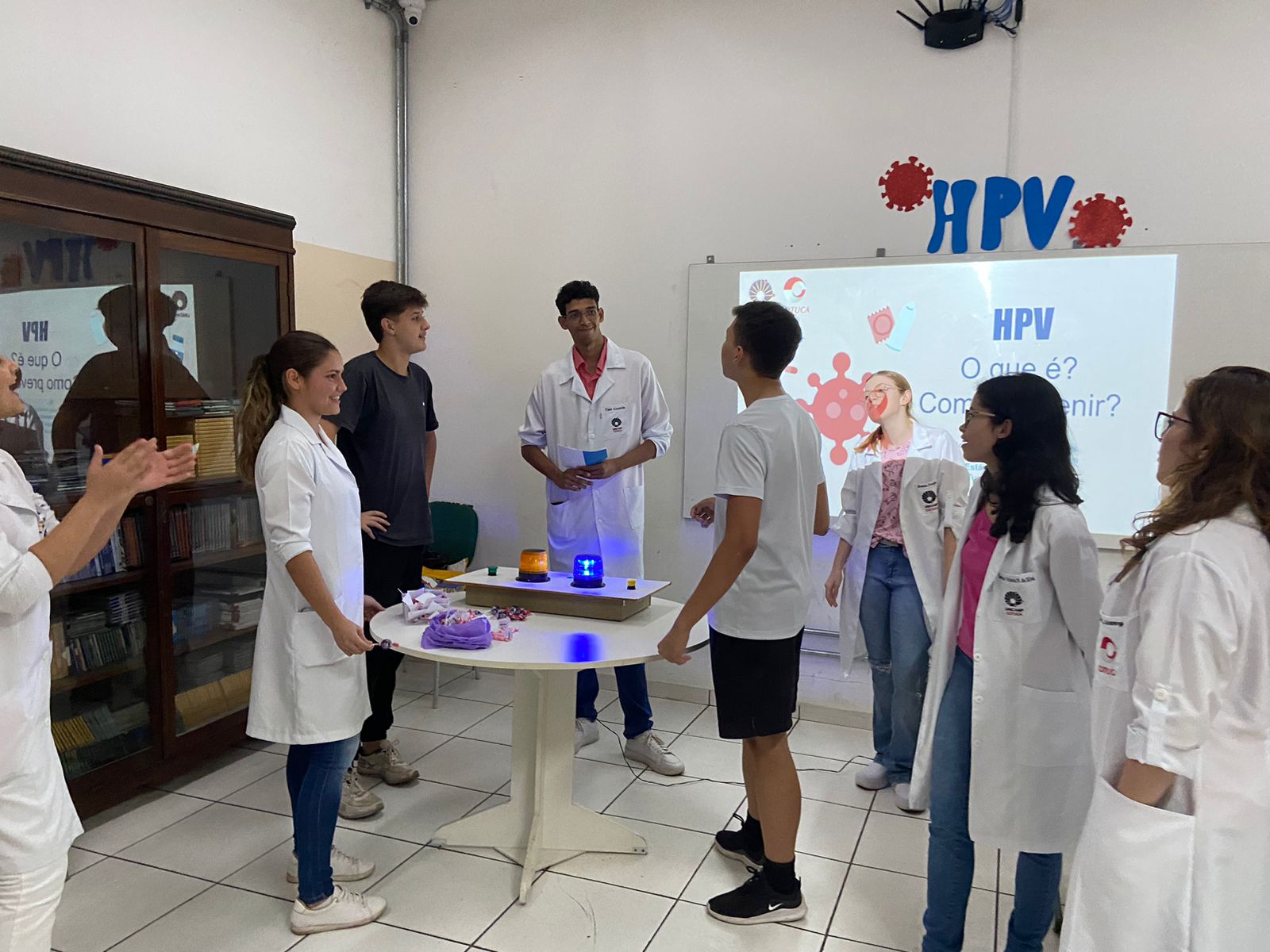 No dia 29/10 os alunos do 2º ano do curso técnico de Enfermagem integrado ao médio, em estágio no Centro de Saúde Guanabara, realizaram uma ação educativa aos alunos do Ensino Médio da Escola Estadual Aníbal de Freitas. A ação educativa foi uma das atividades referente ao Outubro Rosa. Os alunos ministraram uma palestra sobre o tema HPV, orientando os escolares sobre modo de transmissão, sinais e sintomas e as principais medidas preventivas, como uso do preservativo e vacinação contra o HPV. Os alunos desenvolveram cartazes, folders de orientação e realizaram um jogo tipo “passa ou repassa” que fomentou uma manhã de muito aprendizado e descontração entre os jovens. A ação foi coordenada pela Profa. Flávia (Cotuca) e a Enfermeira Maria Rosa (CS Guanabara). A ação teve como objetivo a redução das taxas de incidência do HPV entre os jovens e o aumento da meta vacinal contra o HPV na cidade de Campinas.