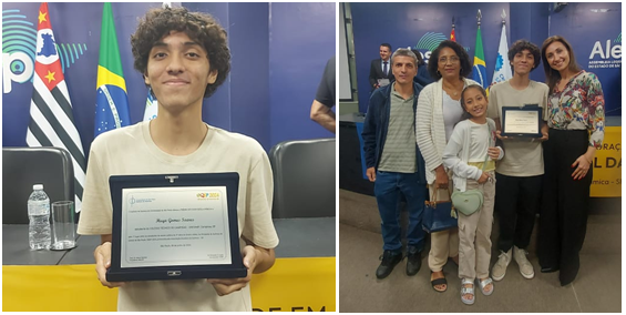 O estudante Hugo Gomes Soares foi homenageado na Alesp, pelo excelente desempenho na prova da Fase II da Olimpíada de Química de São Paulo (OQSP), na qual recebeu medalha de ouro pelo 2º lugar na classificação geral e 1º lugar entre os estudantes de escolas públicas.