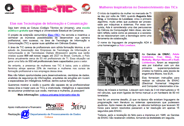 Seja bem-vindo(a) ao programa ELAS-<TIC>! Este projeto é especialmente dedicado a jovens garotas do 9º ano do Ensino Fundamental ao 3º ano do Ensino Médio, que não sejam alunas do Cotuca, e que estejam interessadas em descobrir e explorar as diversas oportunidades de carreira disponíveis nessa área.
